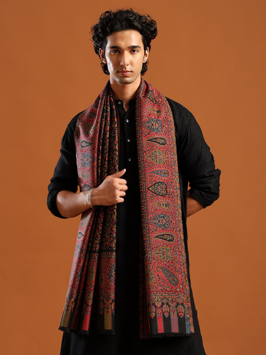 • Stylish Kani Kalamkari shawl for men, elegant wrap offering warmth, comfort, and artistic charm Pair with Sherwani or Kurta at weddings or drape over western coats for Indo-fusion elegance.