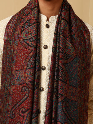 • Stylish Kani Kalamkari shawl for men, elegant wrap offering warmth, comfort, and artistic charm Pair with Sherwani or Kurta at weddings or drape over western coats for Indo-fusion elegance.