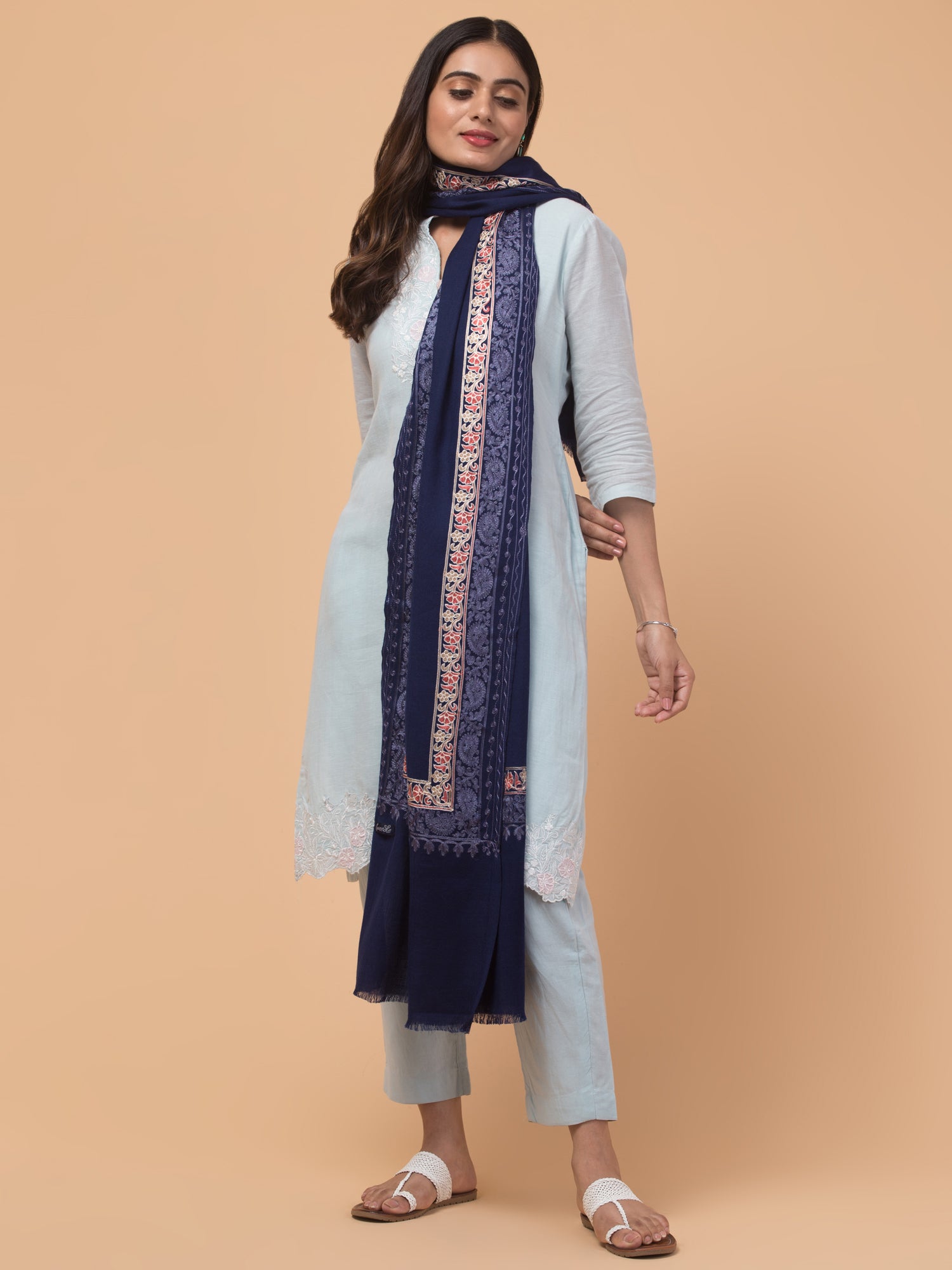 • This elegant Kashmiri embroidery stole comes alive with delicate paisley and floral designs, carrying the charm of centuries-old Kashmiri heritage in every detail.