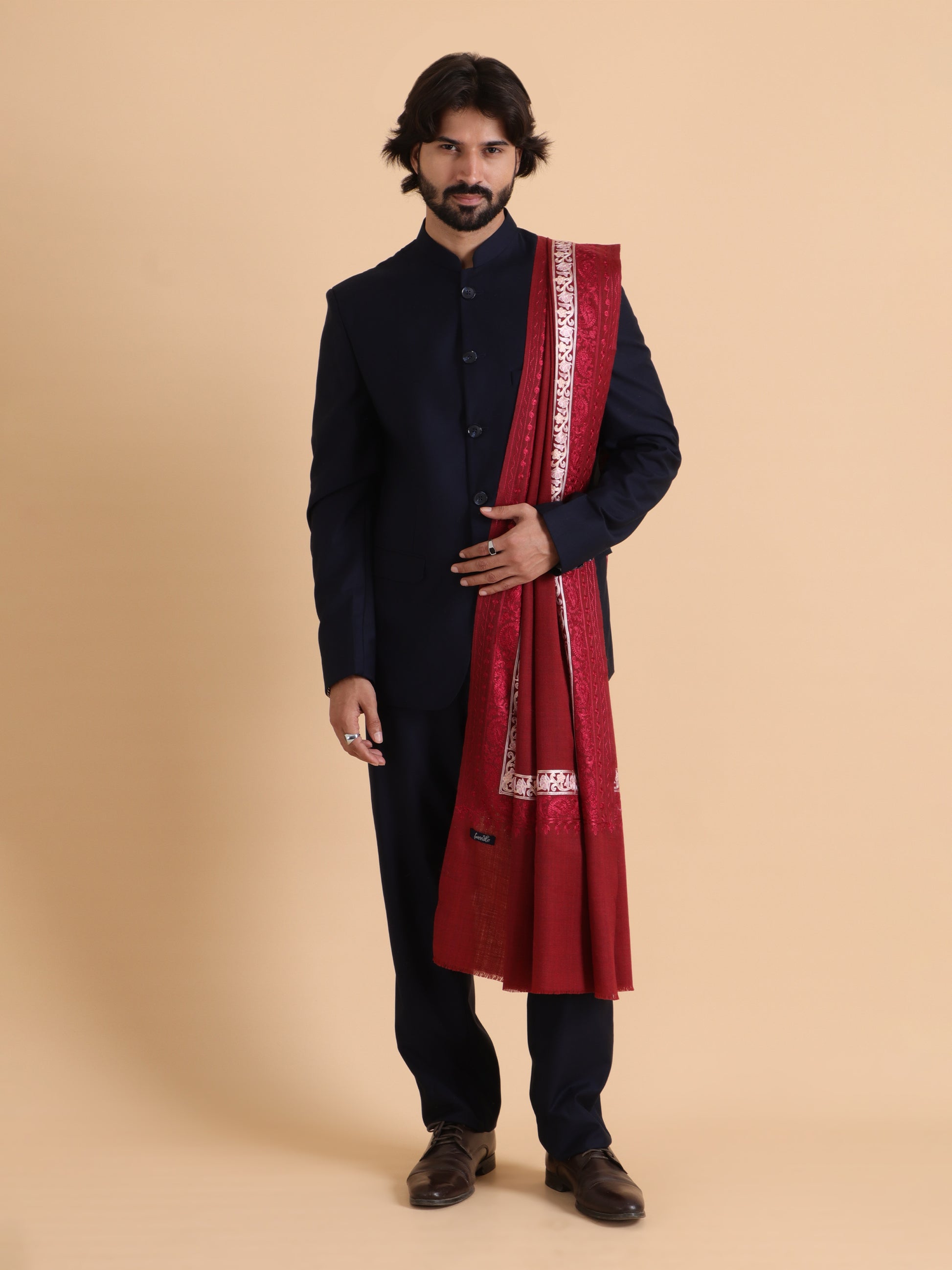 Tweedle Fine Wool Embroidered Stole/Scarf for Men -Maroon, Medium Size -28x80