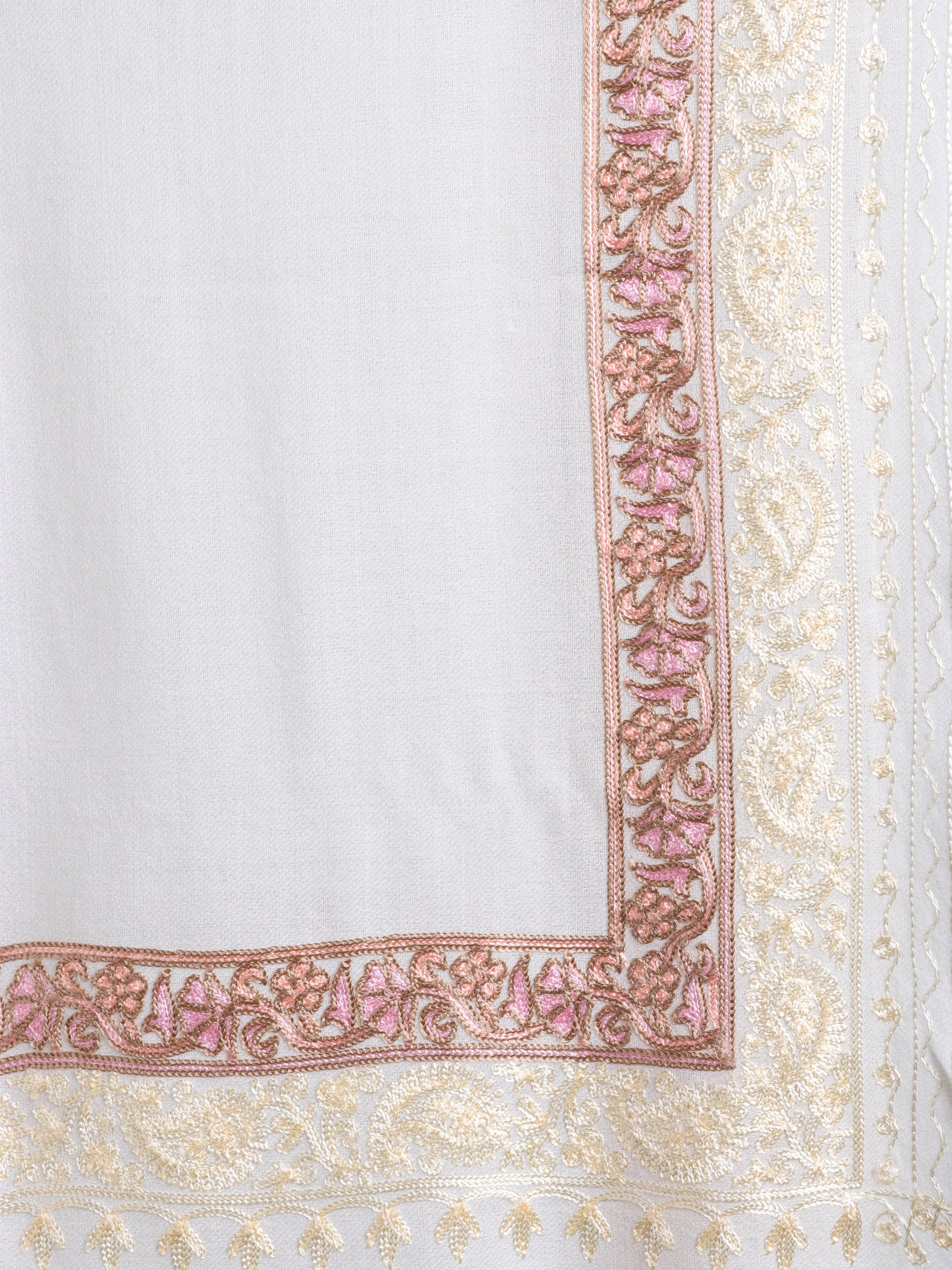 • This elegant Kashmiri embroidery stole comes alive with delicate paisley and floral designs, carrying the charm of centuries-old Kashmiri heritage in every detail.